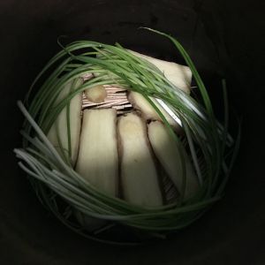 先铺上整棵的小葱和切成大片的生姜