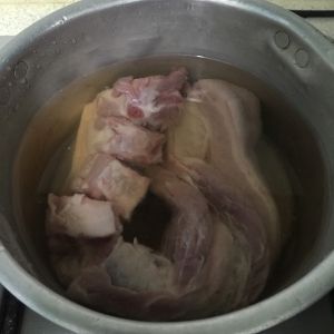 五花肉整块放入水中倒入一汤勺料酒焯水定型,中间翻面