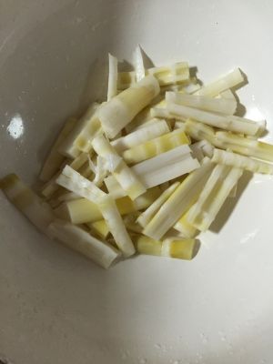 净锅入油烧热,先把春笋头入锅中煸炒一下,再倒入春笋尖炒一下。