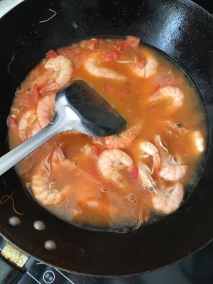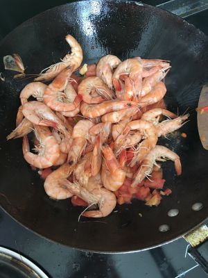 另起锅油热后倒入两勺番茄酱!烧热后把炸好的虾倒入锅内翻炒均匀!