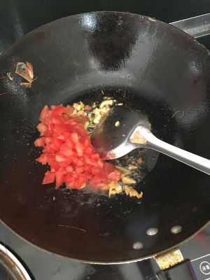 锅里倒入姜蒜,西红柿翻炒