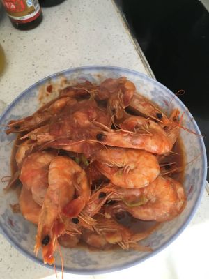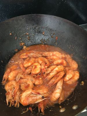 热锅冷油下姜片,蒜片,煸香后放大虾,颜色变红后放入一碗料汁(糖,料酒,生抽,盐,黑胡椒粉),改中火盖盖儿一分钟后虾翻面,再烧一分钟,大火收汁,就大功告成啦!