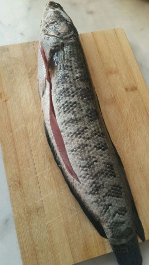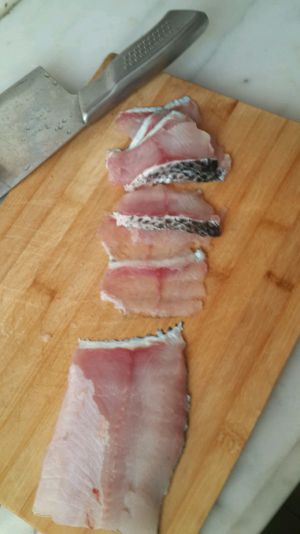 将黑鱼去头,中间鱼骨为准上下两边肉削下,如图所示削成鱼片
