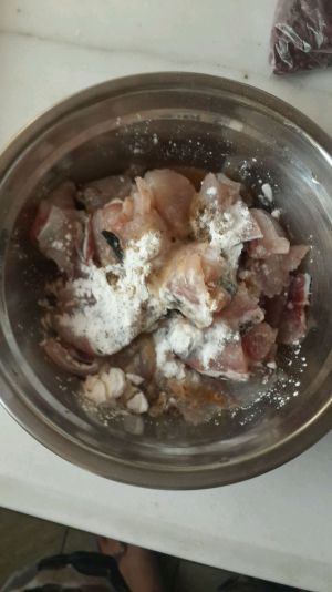 鱼片削好后放入生粉、适量的料酒,几滴醋和酸菜包中配有的鱼的调味料少许,然后用手抓腌制一会