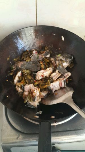 锅烧热到少许的油,放入葱姜蒜红椒后将鱼骨放入锅内翻炒,然后将酸菜放入锅内翻炒