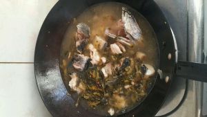 下葱姜蒜煸炒,然后下鱼头鱼骨,因为这部分比较难熟。