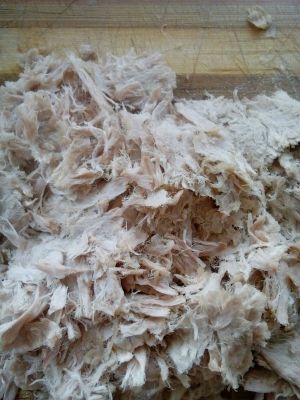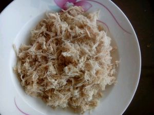 将肉掰成小块,再撕成细丝,尽量使每一根粗细均匀