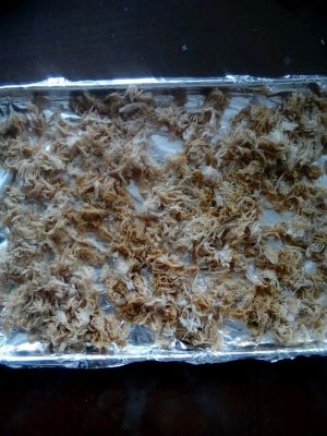 炒好的肉松要趁热摊开晾凉,摊开面积越大越好,不要使肉松堆积,彻底晾凉后即可装瓶密封