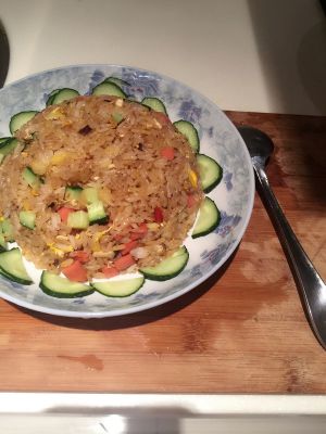 米炒散后放炒好的配料以及黄瓜丁,出锅撒小香葱放味精.