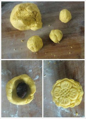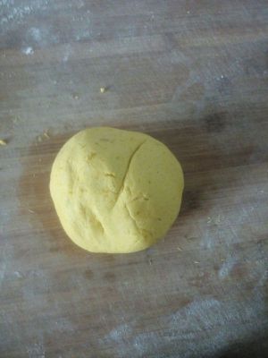 取一面团用大拇指弄个窝加入卡仕达酱馅搓圆慢慢压成饼状