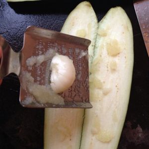 将茄子对半切成两瓣,用小刀划开一道道口子