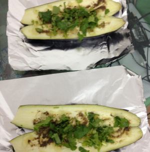 放入茄子(茄子去头,两头用刀划十字),盖上锅盖,开小火烤10分钟左右(根据茄子大小而定)即可;