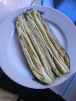 烤箱预热到200度。茄子洗净,烤盘垫上锡箔纸,纸上涂一层薄薄的色拉油。茄子上也涂上色拉油。放入烤箱烤20分钟。