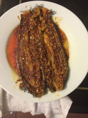 将炒好的酱倒入蒸好的茄子上,撒一些孜然,可以放到划痕里,更加入味。进入烤箱200度20分钟。