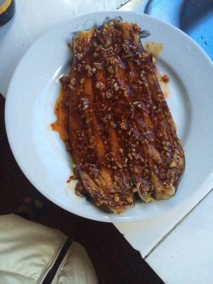取出烤好的茄子,淋上酱汁,撒上香菜碎即可享用