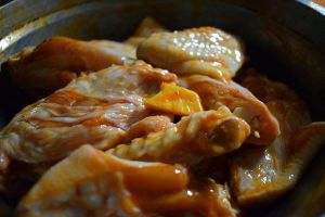 取出,把准备好的蜂蜜涂在鸡翅上。我喜欢比较甜的,直接刷的蜂蜜,不喜欢太甜,可以把蜂蜜稍微稀释一下。