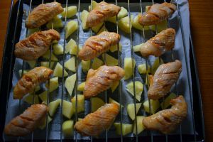 烤箱预热,上火180℃,下火200℃(根据自家烤箱温差酌情调整) 将鸡翅摆在烤盘上,放入烤箱,26-35分钟 ps:鸡翅在烤箱中层,土豆在鸡翅的下一层