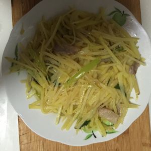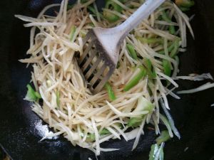 韭菜遇热后很快就软了,如果不喜欢土豆丝颜色太白,可以放点生抽酱油提鲜提色;