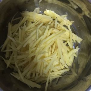 土豆切丝泡水。洗去表面淀粉,捞起沥干