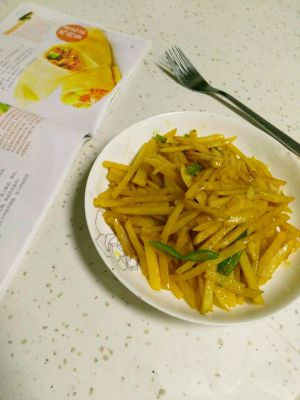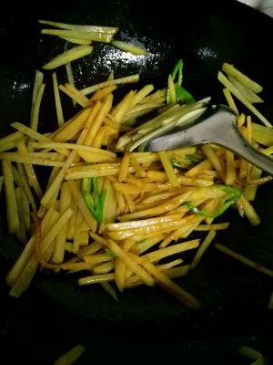 倒入土豆丝翻炒,加一点水,小焖一会儿。