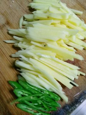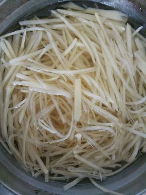 土豆切成土豆丝,用清水冲洗两遍,洗去多余的淀粉;