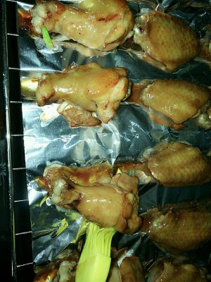 把烤盘放入烤箱中,温度200度,时间15分钟,然后取出。在翅根两面嗯都刷上蜂蜜水,再入烤箱中烤15分钟。