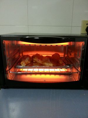 烤箱上下火200预热,烤盘垫上一层锡纸(为了更好的清洁),烤翅排排码好在烤架,放入烤箱中层,烤30分钟