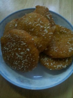 把油倒入锅中,烧热后,南瓜饼再入锅!小火炸至金黄,捞起!