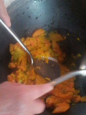 南瓜放高压锅中烧熟、烧嫩,去掉水分!(多了可以当南瓜汤喝;我在烧的时候放了白糖,不放的话就在和面的时候放,我建议最好烧南瓜的时候就放)