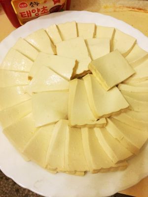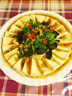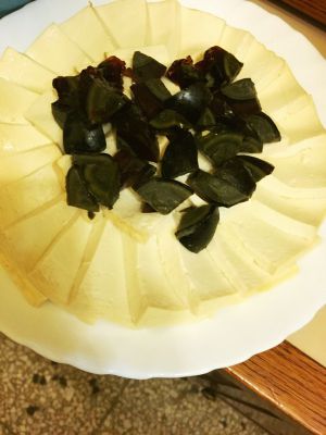 豆腐整块,我买的是鲜豆腐,开启的时候弄不好,裂了,然后用刀切片或者格,皮蛋切碎,本人不会摆盘,能吃就行