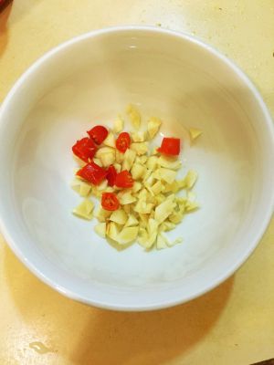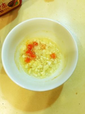 蒜瓣捣碎,加入尖椒、朝天椒、蚝油、生抽、白醋