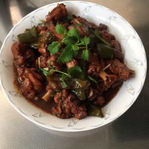 放入腌制好的鸡块,翻炒成金黄色出味。再倒入酱油上色