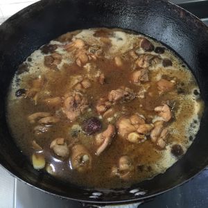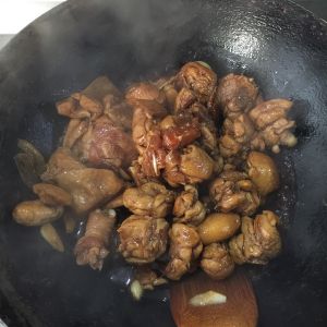 炒好的鸡块儿加入原来的鸡汤,炖制。因为焯水的几块儿易熟,所以炖的时间不要太久大概十五二十分钟吧!大火烧开转小火慢炖保持沸腾就好