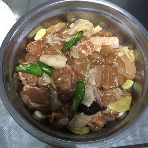 剁好的鸡块儿温水下锅焯去血沫,不要太久去除血沫就好。承出后加入盐 料酒 白胡椒粉腌制,大概二十分钟。