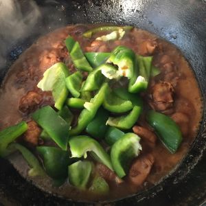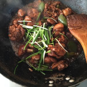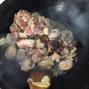 腌制的鸡块倒入锅内翻炒三~五分钟。