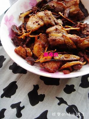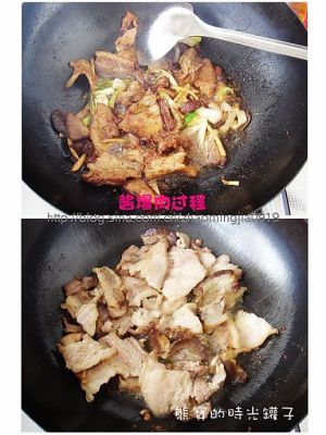在炒锅中倒入适量豆油(油不要放太多,五花肉本身会析出很多油,我就是没有经验到了不少的油,结果差不多倒出小半碗荤油呢,也好,留作他用),放入葱姜丝,炒香,加入五花肉片,煸炒。 五花肉炒出香味变色后,加入大酱,少许糖提味,不停煸炒。