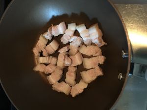 把洗净五花肉切成小块,放入姜片,水没过肉为宜,煮开至浮末飘起,肉变色,捞起,过干水分。在切的过程中把肉放平展,切出来的肉即好看又肥瘦适宜,口感也好。