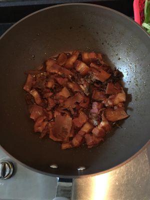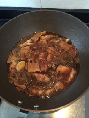 下入梅干菜,这里的梅干菜是自己家做的,有笋干和万年青菜。在盖锅焖煮,煮至水快干放少许盐在收会汁。