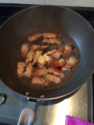 煎的两面微黄倒入水,老抽,料酒,生姜,八角,桂皮,香叶,腐乳水,红糖,大火盖锅焖煮开转小火。