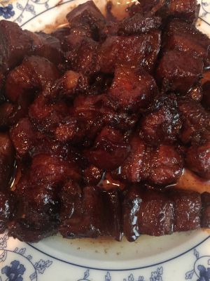 锅里放油,油热依次放入姜蒜桂皮八角干辣椒炒香,放入炸好的五花肉翻炒出香味,加入糖水翻炒,再加入啤酒翻炒,再加入清水放入葱,加适量盐和料酒,盖上锅盖焖一小时左右!这时大家看到的肉颜色还不是那么好!