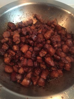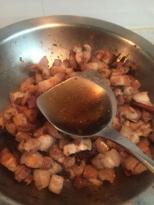 至金黄色即可放入3铲料酒,2铲老抽,1铲生抽翻炒至上色。老抽上色比较好,但味道还缺一点鲜味,所以加生抽完全是为了调味。