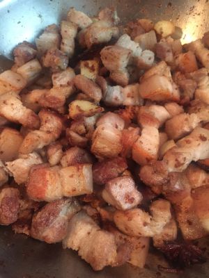 倒入煮好的肉炒至两边金黄。在这个过程中一定要不停的翻炒,不然会粘锅。