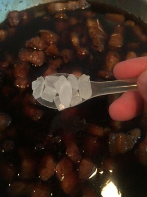浇入刚才煮肉汤,以没过肉为宜。加入三小勺冰糖,煮开,关小火焖1小时。在50分左右时加入5克盐。然后大火收汁。