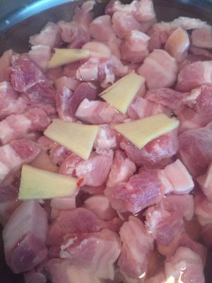锅里放清水,五花肉冷水下锅,加入葱姜料酒