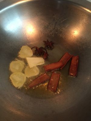 把油烧热,放入桂皮、八角、姜片翻炒入味。