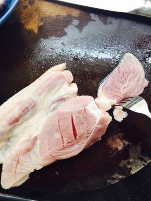 猪肉洗净,用刀叉划出几道口子,扎些洞洞好进味