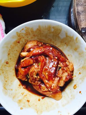 将所有酱料放进肉里腌制2小时,用手按摩肉,腌制前用叉子在肉上叉几个小洞