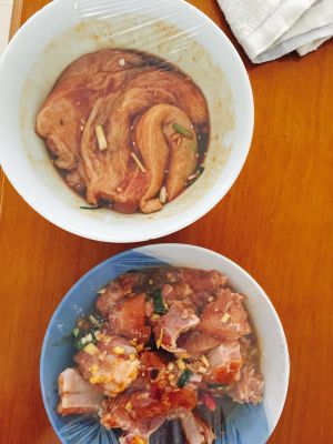 我这边的猪肉有些腥,所以我先用黄酒和生姜腌了3小时,之后将肉沥干水,也可以用厨房纸吸干,然后加入叉烧酱腌至少24小时,并在里脊肉上用牙签扎满孔,然后按摩。放入冰箱腌,不然容易坏。
