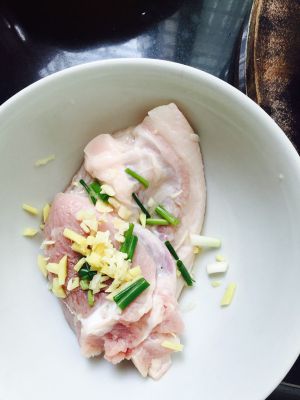 肉泡一下去掉血水后,厨房用纸吸干水分,用大量姜片腌3小时(中途翻一下)