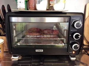 烤箱预热,将腌好的里脊肉放入烤架,底下一层放烤盘铺锡纸,先用200度烤10分钟